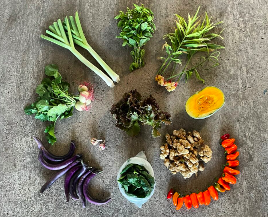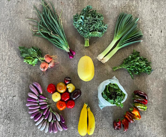 PUERRO, CEBOLLIN, APIO, PAPA, BETARRAGAS, NABOS, RABANITOS, COLIRRÁBANOS, HINOJO, ESPINACA, MIX DE HOJAS, RÚCULA, AJÍ, PIMENTÓN, BERENJENAS, PEPINOS, ZAPALLO ITALIANO, CILANTRO, PEREJIL, ALBAHACA, TOMATES, REPOLLO, AJO, KALE, Y MUCHO MÁS...